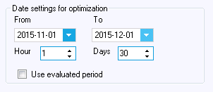 By default, the data for the optimization is selected different from the evaluation. For the optimization period, all files within the period are used, and from each file data for the desired prediction horizon is extracted (e.g. 13-14 hours). The program then constructs a time series by overwriting older data with data from newer files within the period. This way, the in-data for the optimization will differ from the in-data for the evaluation. For example if we daily do both a forecast in the morning and one in the afternoon, the optimization will use both these forecasts as input, whereas an ‘elspot’ template will filter out all forecasts made in the afternoon. In the ‘Extract settings for optimization’ we may filter out files files we don’t want to use, in the same way as for the evaluation extract settings. For example, ‘Export type’ and ‘Mode’ may be filtered on. If we specify an extract setting such as ‘elspot’ below, The optimization will use exactly the same files as the evaluation would have used with respect to the extract settings.