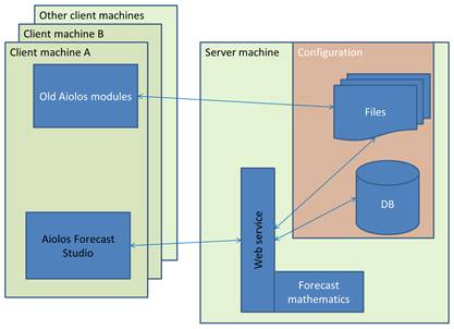 Aiolos Forecast Studio has two parts; one server part and one client part. Both the server and the client can be installed on the same computer. Usually the Aiolos server is installed on a server machine and the users access the forecasting system using Aiolos clients installed on their own machines.