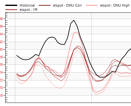 If we combine “All separate” with the extract selection “elspot”, five curves are displayed in the diagram (with the exception of the result curve), and if we use the extract selection “elspot+ 2 days back” (see above) instead, we have ten different forecasts to evaluate. If we have exported and unadjusted checked as well, this number increases to 14. For example, we then evaluate both the unadjusted forecast and the exported forecast two days and one day before the evaluated day.